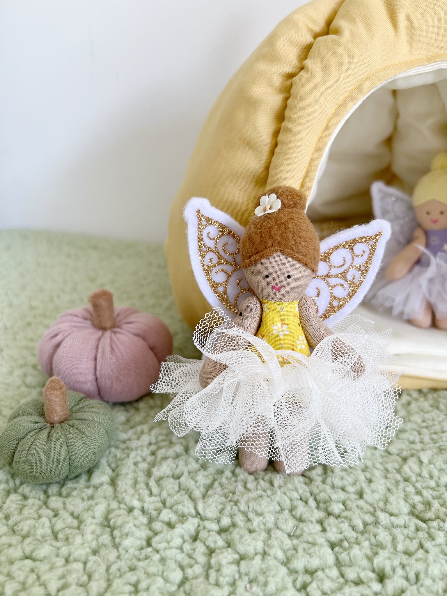 *Tiny handmade fairy doll with fixed sparkly wings, tutu and flower in her hair. The tutus are removable for extra play.